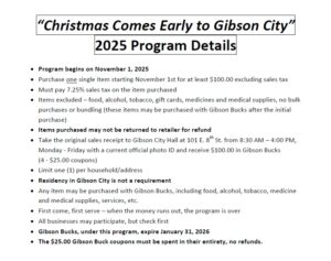 Presenting the “CHRISTMAS COMES EARLY TO GIBSON CITY’ Gibson Bucks Program! Just in time for the Holidays.
